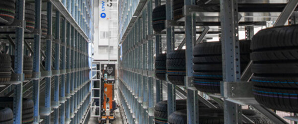 Nach sorgfältiger Analyse und Beratung setzt sich eine Pionierlösung durch: ein Hochregallager, das zugleich als automatisches Sortier- und Pufferlager implementiert wird. Es wird nicht nur innerhalb der bestehenden Halle hochgezogen, sondern auch über eine komplexe Fördertechnik sowohl an die Produktion als auch die Kommissionierung, die Fertigwarenlagerung und die Qualitätskontrolle angebunden. Pro Tag können 16.000 Reifen durch das Hochregallager geschleust werden. Die Auslagerung erfolgt postwendend, sobald die Anzahl an Exemplaren eines Reifenmodells beisammen ist, die einer Paletten-Ladung entspricht.
