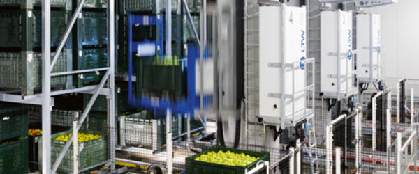 The fruit processing cycle in Latsch is dictated by the seasons. During the apple harvest in September, more than 300,000 bins of apples are cooled to 2 °C in a very short time. Oxygen-reduced CA cells (controlled atmosphere) allow long-term storage without loss of freshness. In the course of the year, the entire harvest is gradually worked through, which means sorted and packaged by size, color, and quality. The high-bay warehouse comes into play as a buffer between the sorting system and the packaging hall. In contrast to normal stacking operations, the six stacker cranes in use here apply the FIFO principle (First In, First Out). This results in a freshness benefit of up to a week!