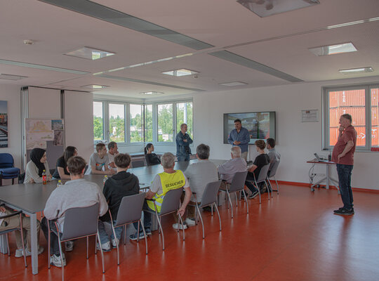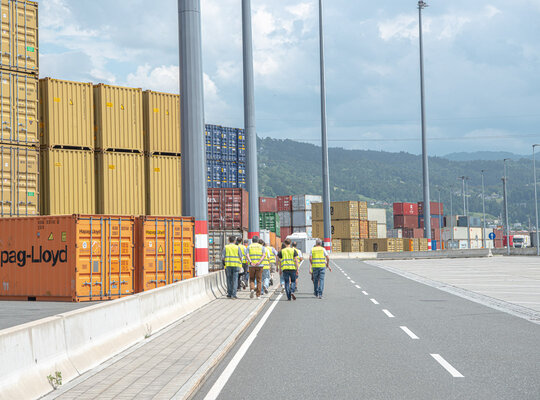 Das Highlight des Tages war mit Sicherheit die Besichtigung des Areals. Dabei boten die Querverbindungen zwischen dem gehörten Vortrag über Jannicks Diplomarbeit und dem gerade gesehenen ein besonderes Zuckerl. Spannend war auf jeden Fall, dass die Schüler nicht nur Einblicke in den Umschlagplatz erhielten, sondern auch alles rund um die Themen Containerreparatur und andere Dienstleistungen rund um die Container erhielten.