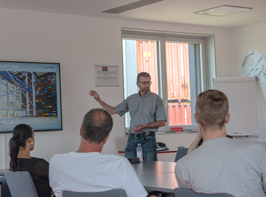 Bevor dann der gesamte Terminal besichtig wurde, gaben noch zwei LTW-Mitarbeiter besonders spannende Einblicke in die Logistikwelt. Jannick, ehemals HTL-Schüler, hat 2020 seine Diplomarbeit über Schwerlast-Regalbediengeräte und Containerhandling bei uns geschrieben. Heute ist Jannick vollwertiger LTW-Mitarbeiter im Bereich Vertrieb und Projektierung und arbeitet eng mit seinem damaligen LTW-Betreuer Rainer an Containerprojekten. Jannick konnte bei der Präsentation exklusive Einblicke in sein Themengebiet liefern. Zusätzlich war es für die Schüler, die nächstes Jahr maturieren werden, spannend zu erfahren, wohin sich die Arbeitslaufbahn eines ehemaligen Schülers entwickeln kann und welche Möglichkeiten LTW dabei bieten kann.