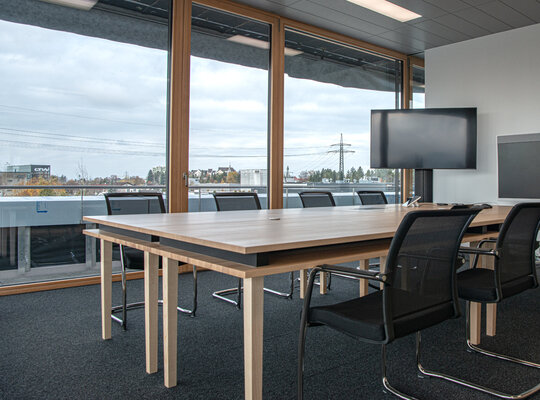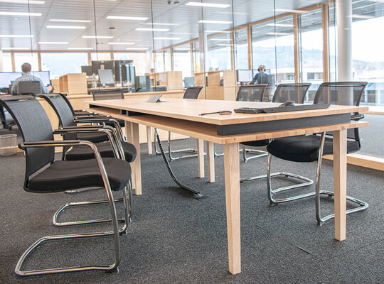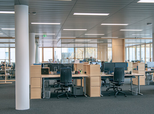 Der helle, modern ausgestattete Raum sowie das technische Equipment lassen keine Wünsche übrig. Die hochwertigen, hellen Tischlermöbel in Vollholz, die freundliche, offene Atmosphäre und die Pausenräume in jedem Stock bieten uns maximalen Komfort. Es wurde viel mit Glas gearbeitet und die Büros der Führungskräfte sind inmitten der Mitarbeiter angesiedelt. Das verkürzt nicht nur die Wege, sondern senkt auch die Hemmschwelle vorbei zu kommen. Man sitzt mitten im Team.